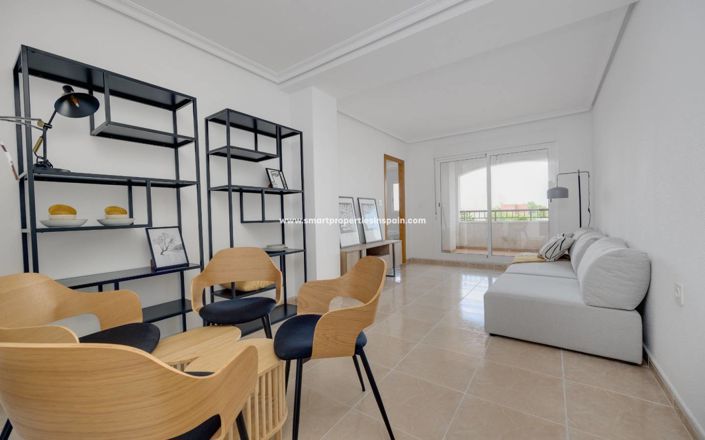 Modern apartments in a well-maintained residential building with a communal swimming pool. The apartments feature at least one bedroom and one bathroom, a kitchen, a living/dining room, and a covered terrace.