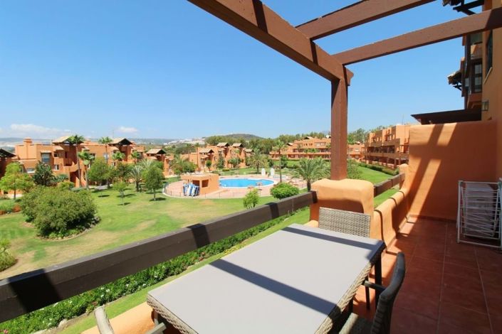 Casares del Sol poolside apartment in the beautiful grounds of Casares Costa. The apartment has a south-west facing terrace with views over the gardens and pools and leads directly into the lounge. The kitchen is well equipped. And there are 2 bedrooms and 2 bathrooms, to sleep 4. The apartment is on a large, relaxed complex with well-maintained gardens and pools.Just a short walk or drive from the apartment to the nearest bar, restaurant and gym. And a bit further to Casares sandy beach, 800m away. Or you can drive inland for a few minutes to the pretty white village of Casares in the natural reserve of Sierra Bermeja.