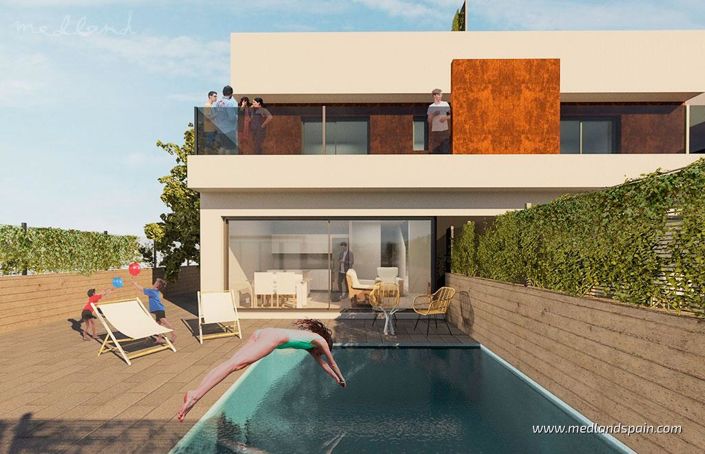 New project of semi-detached villas with private pool in Pilar de la Horadada, only 10 minutes drive from the magnificent beaches of Torre de la Horadada, on the Costa Blanca South. The town offers a wide range of services such as large supermarkets, banks, pharmacies, bars and restaurants, a medical centre and superb municipal sports facilities with tennis and paddle courts, football, indoor swimming pool and gyms. In addition, the magnificent La Zenia Boulevard shopping centre is only 15 minutes away by car. For golf lovers, there are several golf courses within a radius of 15 km, such as Lo Romero Golf, Las Ramblas, Villamartin Golf or Las Colinas Golf. The area is well serviced by road, which allows you to reach Orihuela Costa in little more than 10 minutes and in 20 minutes Torrevieja, the main tourist destinations of the area. Murcia and Alicante airports are 35 and 50 minutes away respectively. An ideal location for those looking for a holiday home or permanent residence.The development offers modern semi-detached villas with 3 bedrooms and 3 bathrooms, distributed over two floors plus solarium, large terraces and private swimming pool. The ground floor has an open plan living area, comprising a living-dining room and kitchen with large windows giving access to the outside area. This floor is completed with a bedroom, a bathroom and a laundry room. The remaining two bedrooms are on the first floor, the master bedroom has an en suite bathroom and access to a terrace with views of the swimming pool. The interior stairs lead to the solarium, a space designed to enjoy the sun and the spectacular Mediterranean climate on the Costa Blanca.All the properties include furnished kitchen, pre-installation of ducted air conditioning, aerothermal system, fully equipped bathrooms, installation of photovoltaic solar panels, private swimming pool and parking area within the plot.