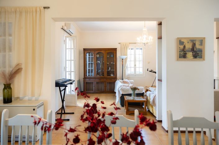 Set amidst a verdurous Mediterranean stone pine forest in the village of Kompitsi, just outside of Corfu City, this traditional Corfiot-style villa offers privacy and tranquillity combined with all modern amenities.The 215 sqm villa stands on a 2100 sqm plot and unfolds over two floors. The 175 sqm ground floor features three bedrooms, a very spacious living/dining room, kitchen, bathroom and guest WC, and a storage room. The living room offers three areas: the fireplace area featuring a large bench, the dining area and the sitting area. The 20 sqm master bedroom has three windows with a view of the garden and the picturesque Kampitsi hamlet, with its traditional Corfiot architecture. The second bedroom has a window looking at the garden and a balcony door leading to a private veranda with a sitting area where one can relax, sunbathe or even meditate in absolute privacy. The third bedroom features two large windows overlooking the garden. All bedrooms are air-conditioned. The main bathroom is fitted with a bathtub, two marble basins, a large mirror and a bathroom linen closet.The second floor is 40 sqm and features a guest room with a kitchenette and a bathroom. It has its own entrance.The villa's garden features many paved paths and pergolas planted with fruit-bearing trees, shrubs, and local flora. The plants have an automated irrigation system. Parking is facilitated in the shade of a large mulberry tree, and the infrastructure to install an EV charger is also present.Rental potentialIts central location, size, amenities, and spacious gardens make this villa ideal for holiday rentals. Corfu is a very popular holiday destination on the Ionian island, attracting hundreds of thousands of visitors all year round. It offers direct flight connections to many major European cities.Location - DistancesKompitsi is a small village on the outskirts of cosmopolitan Corfu city amidst a pine forest, granting it a tranquil ambience in stark juxtaposition to the city's hustle and bustle. Its central location makes everything on the island easily reachable, from the carte postale beauty of Pontikonisi to the sandy beach of Kontoyalos and the countless entertainment options offered by Corfu city itself.Corfu Old Town and Fortresses: 7 kmInternational Airport of Corfu: 5 kmPontikonisi: 6 kmKontoyalos Beach: 8 km