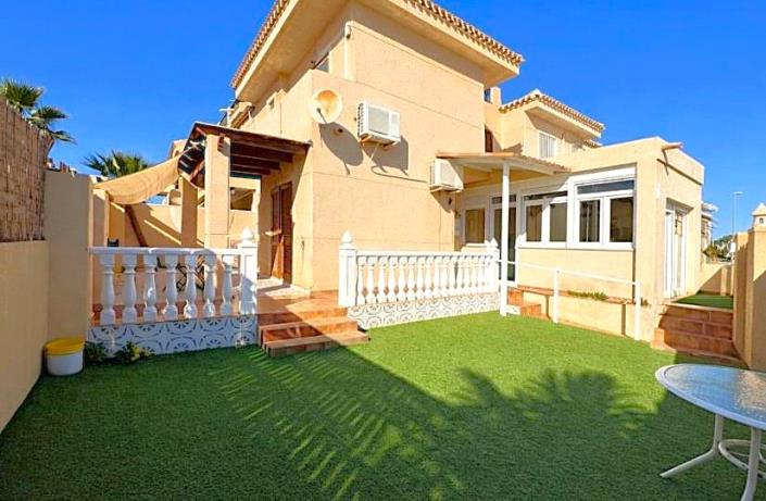 This south-facing 3-bedroom; 2-bathroom house is close to the beach and in a desirable area of Playa Flamenca. Close to all amenities. Entrance through a garden and shaded porch into a spacious lounge/diner. Fully fitted independent kitchen. Bedroom with fitted wardrobes. Further bedrooms upstairs and fitted bathroom. Terrace off principal bedroom.
