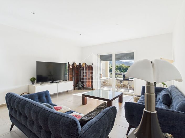 The apartment consists of a spacious living room with an open-plan fitted kitchen, opened onto large terraces, including a covered area, offering a true extension of the living space and an ideal setting to enjoy the outdoors all year round.