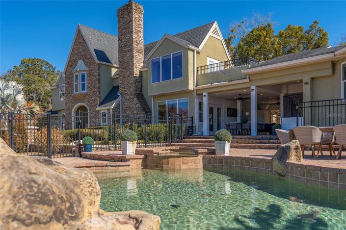 Step outside to your resort-style oasis featuring large pool with expansive deck and water feature. Two additional outdoor entertaining areas include a dedicated space with an outdoor kitchen. The pool house offers large windows with panoramic views, custom cabinetry, granite countertops, upgraded tile flooring, a Murphy bed, and a full custom bathroom, perfect for guests.