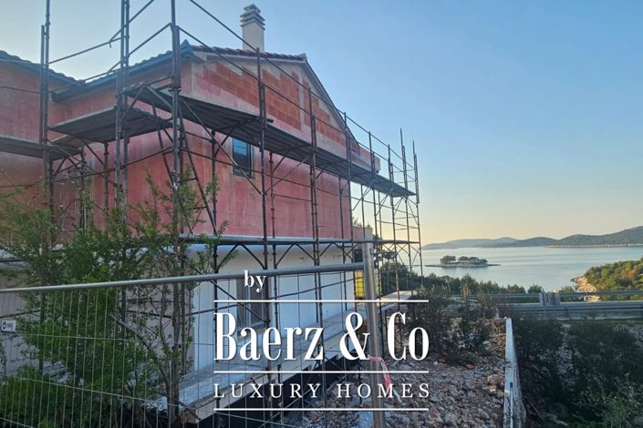 Newly built house in traditional Dalmatian style with a gross area of 250 m2, while the net area is 207 m2, located only 100 m from the sea. The house is divided into three floors, a basement, a high ground floor and a first floor with a courtyard and parking in front. Located in a quiet part of the village and a beautiful beach.In nature, a house with a basement and two residential floors, the ground floor and the first floor. It is a house with a comfortable living room, kitchen with dining room and three comfortable bedrooms, each with its own bathroom, two rooms with their own balconies, all with a beautiful sea view.The basement area of 65 m2, consists of a basement and a storage room of 56 m2 and an internal staircase of 9 m2.Ground floor area of 74.3 m2, of which the closed residential part is 59 m2 and the terrace is 15.6 m2, and consists of a comfortable living room with an open-plan kitchen and dining room (32 m2), a shared bathroom and a spacious terrace in front of 15.6 m2 with a beautiful view.First floor area of 74.3 m2, of which the closed part is 59 m2, two balconies of 15.5 m2 and consists of three comfortable bedrooms, each with its own bathroom, and a hallway and a wardrobe-storage room, two rooms have access to their own balcony with a beautiful sea view, and a third balcony adjacent to the third room.Excellent opportunity as an investment or for living thanks to the exceptional location near the sea and beautiful beaches and the proximity of all amenities in the immediate vicinity.For more information, I am at your disposal