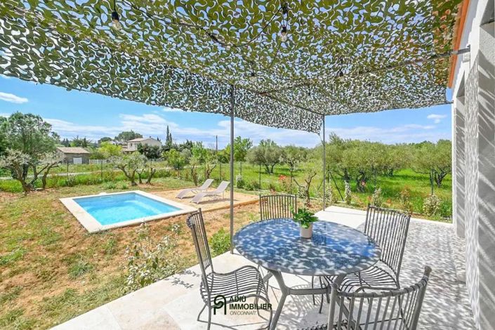 Only 5 minutes from Uzès, near the greenway, this single-story home built in 2024 offers about 73 m² of living space on roughly 800 m² of land, with a pool, south-facing terrace and unobstructed views of olive trees.