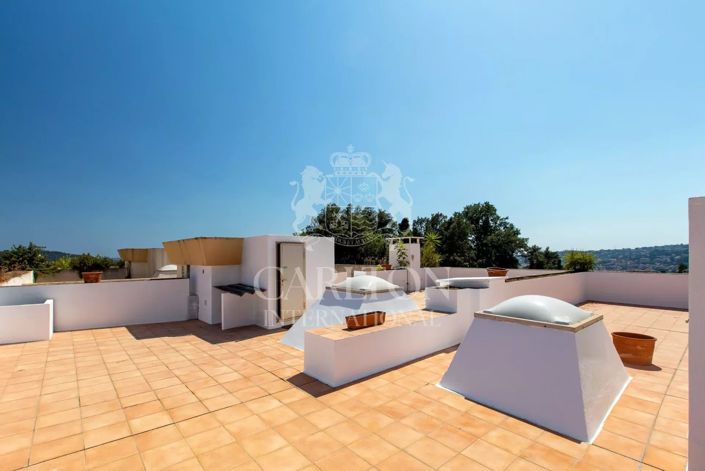 It features three terraces and a 140 m² solarium accessible directly from the apartment. The layout includes an entrance hall, a very large living/dining room with a fireplace, an independent kitchen, 3 bedrooms, 2 bathrooms (shower or bathtub), a guest Wc, and a dressing room.