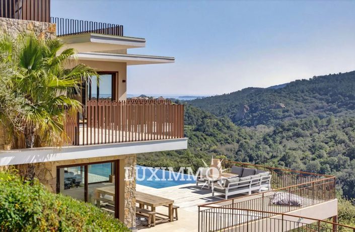 Mandelieu – Located in a secure estate, in absolute calm, just 15 minutes from the beaches and the port of La-Napoule, enjoying panoramic views, this contemporary 318 m² villa is built on a 2100 m² land with a heated pool.
