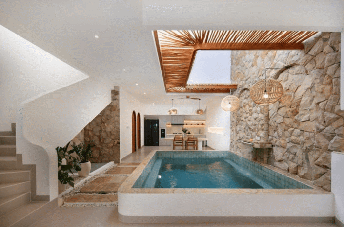 Spanning 112 sqm of land and boasting a 162 sqm living space, the villas feature a unique design with a semi-indoor plunge pool strategically placed between the living area and kitchen. This distinctive layout not only adds to the villa’s charm but also makes it an ideal choice for holiday rentals.