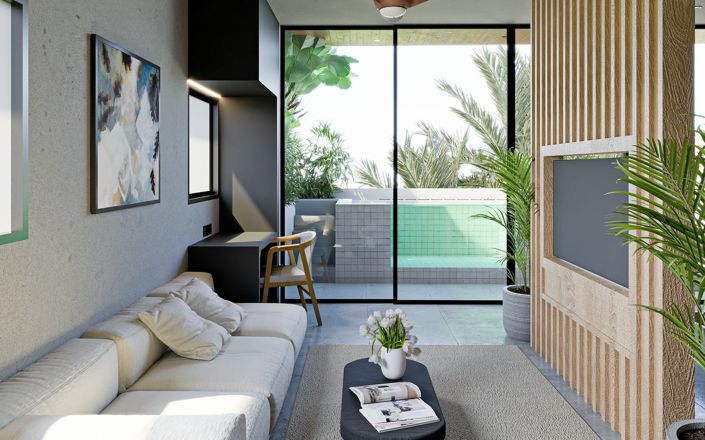 This 1-bedroom off-plan apartment perfectly captures the essence of Balangan’s allure. Set to complete by late December 2024, the apartment is part of a distinctive complex of villas and apartments, positioned on the top floor and facing west to offer breathtaking sunset views. The apartment spans a total of 85 sqm, with 50 sqm of enclosed living space and an expansive 35 sqm terrace complete with sunbeds and a private jacuzzi—ideal for unwinding while soaking in the stunning surroundings.