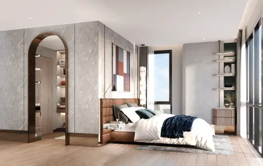 Bright and Airy Living in the Heart of WatthanaThis 91 sqm condo is seriously well laid out—two bedrooms, two bathrooms, and a nice open feel thanks to those large floor-to-ceiling windows that flood the space with natural light. You’ll probably spend most of your time in the main bedroom, which is spacious and comes with a walk-in closet equipped with glass-front cabinets and interior lighting, so organizing your wardrobe will be a breeze.The design is modern but comfy, with warm wooden floors and neutral, earthy tones that make the whole place feel calm and balanced. There’s a marble-topped desk area with a white cushioned chair, perfect for working from home or just catching up on your emails.Highlights include recessed ceiling lights, layered bedding with a padded headboard, and clever built-in shelves and storage solutions that keep everything clutter-free. The vanity table with its large mirror and decorative lighting is a nice touch if you like a dedicated space to get ready.It’s offplan right now, so there’s a fresh feel to it—freehold ownership is a bonus in this area. If you want contemporary style with practical features and lots of natural light in a lively neighborhood, this one’s worth seeing.