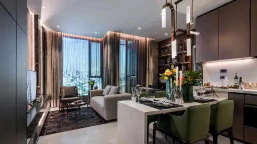 Feel right at home in this thoughtfully designed 2-bedroom condo in Khlong Tan Nuea.The open-plan layout really makes the most of the 72 sqm space, with the living room, dining area, and kitchen flowing seamlessly together. Large floor-to-ceiling windows bring in lots of natural light and give you a great cityscape view, perfect for relaxing evenings or entertaining friends.The living area is comfortably furnished with a gray upholstered sofa and armchair, anchored by a soft area rug that adds warmth to the neutral-toned tile floor. The dining space is genuinely inviting, featuring a marble table set with six green upholstered chairs and contemporary pendant lighting that adds a bit of style without feeling over the top.In the kitchen, you’ll appreciate the modern touches like under-cabinet lighting, white countertops, and dark cabinetry, plus integrated appliances that keep everything sleek and uncluttered. Storage’s handled nicely with built-in shelves filled with books and decorative pieces, and there’s even a secure entry door near the kitchen, which adds a practical touch.Both bedrooms come with their own bathrooms, so privacy isn’t an issue, and the overall minimalist design with clean lines and subtle wood paneling with illuminated black marble accents keeps the space feeling contemporary and polished.
