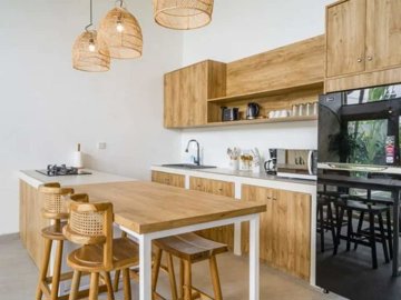 Located in Kerobokan, with easy access to Seminyak and Denpasar, this three-bedroom ensuite villa marries modern design with lots of wood and bamboo accents. Offered on a LEASEHOLD title of 25 years with an option to extend, the fully furnished property sits on 150 sqm of land and has a build size of 120 sqm. Featuring a fitted kitchen, sunken lounge, guest powder room, and parking, the villa’s unique design is complemented by its 6m x 3m swimming pool. The south facing villa can be accessed from a 5 meter wide road.