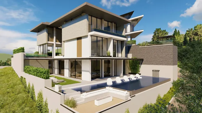 here 3 Floors of Spacious Living: Each floor is meticulously designed to maximize comfort and style.- Private Pool: Dive into your own 67 m² swimming pool for a refreshing escape.- Sauna: Unwind and rejuvenate in the private sauna.- Closed Garage: A secure 18 m² garage for your vehicles.- Expansive Outdoor Spaces: Enjoy 183 m² of terraces, gardens, and an inner garden.Ground
