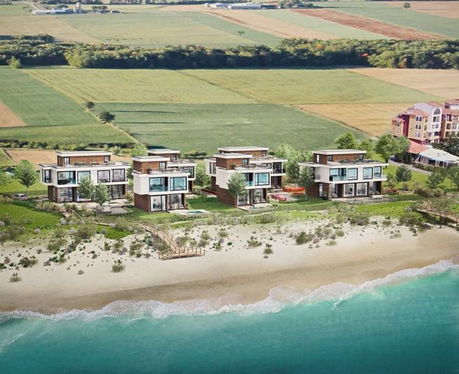 We are pleased to present premium houses in the first sea line, near the village of Aheloy, in the luxurious SALT, SUN, SAND complex. A total of 9 houses are for sale, each with 100% sea view. There are still 2 identical houses available, B2 and B3, priced at EUR320,000 and EUR330,000. Complete finishing would cost approximately an additional EUR20,000 to EUR30,000 without extra requests.