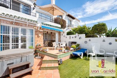 The standout feature of this home is its exceptional outdoor space. It boasts a large, sunny terrace perfect for al fresco dining, complete with a covered seating area and direct access from the living space. Steps lead down to a private patio and garden area, beautifully presented with artificial grass for low maintenance. Here, you’ll also find a relaxing jacuzzi, sun loungers, and additional seating areas—ideal for enjoying the Costa del Sol lifestyle all year round.