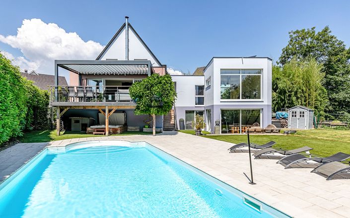 A bright living space by the water: Nestled in a quiet cul-de-sac in Plobsheim, this architect-designed house combines pure lines, generous volumes, and pervasive light. A large suspended terrace extends the living areas to the outdoors, over a landscaped garden bordered by a watercourse, the Krimmeri. The heated pool, high-end equipment, and a standalone extension make it a property that is both functional and elegant. A contemporary house with a pool, perfect for a family seeking space and/or a professional activity at the gates of Strasbourg.