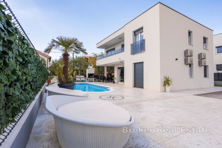 A modern two-storey villa is for sale, located in a quiet part of Kaštela. The villa has a contemporary design, landscaped surroundings, a sauna and private parking. The villa has an area of ??180 square meters, and is spread over a plot of 510 square meters.