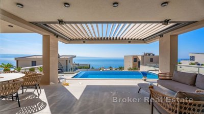 On the ground floor there is also a large living room connected to the dining room, a kitchen, a guest toilet, and a bedroom with its own bathroom. On this floor, there is also an exit to a beautiful terrace with a swimming pool and a sundeck, from which there is an enchanting view of the sea.