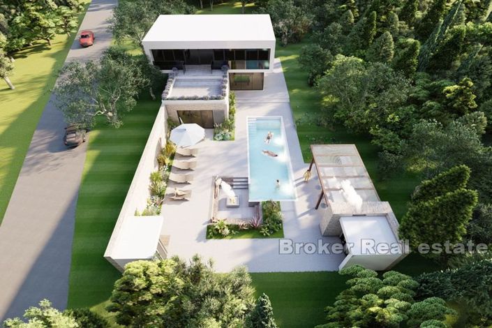 In the olive grove there is a luxury villa under construction on the island of Šolta. The design is a blend of Mediterranean and modern style.