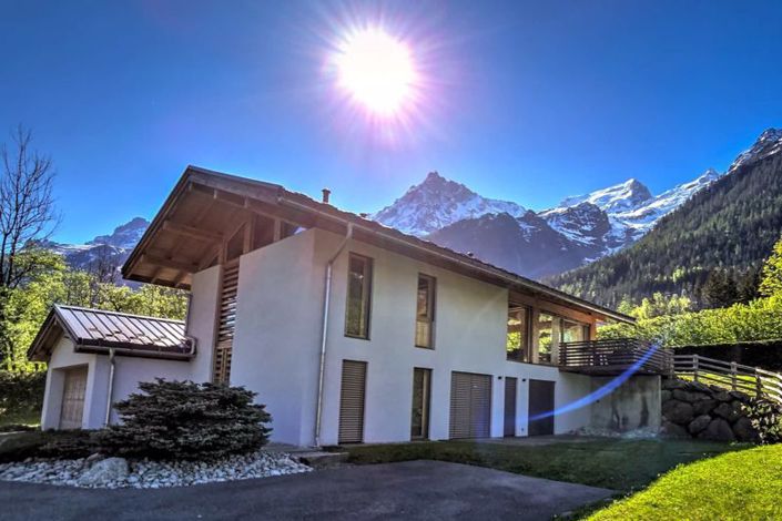 Built to a very high specification, the chalet has been cleverly designed to make the most of the views and faces directly south, straight towards the spectacular Aiguille du Midi and its’ surrounding peaks and the floor-to-ceiling sliding doors open from the main living area straight onto the terrace and garden area.