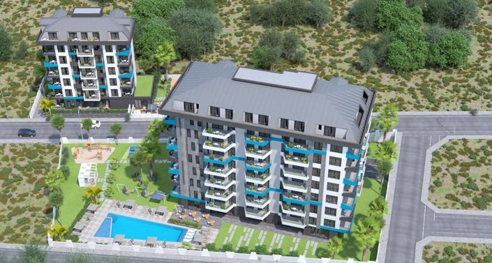 Apartments for sale in Alanya are 90 km from Antalya Airport, 60 km from Gazipasa Airport, 21 km from Alanya city center, 1.9 km from the sea, and 700 m from markets and pharmacies.