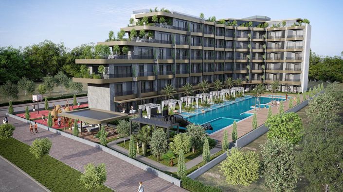 The project, built on a 4,000 sqm plot, offers 1-bedroom, 2-bedroom, 2-bedroom with terrace, and 2-bedroom loft duplex apartment options. All apartments are designed to face the pool. The complex includes an aquapark, children's pool, sports areas, sauna, Turkish bath, steam room, basketball and football fields, gazebo, indoor parking, and reception and security services. Additionally, a 650 sqm outdoor swimming pool is available for residents' use.