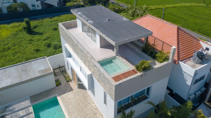 Rooftop bar with an entertaining area, toilet, storage, and spa (bubbles, not heated due to Bali’s hot weather).