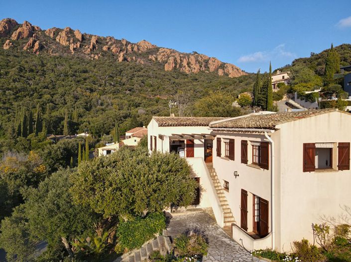 For sale charming 6 rooms villa located in Agay facing a stunning view on the red rocks of the Esterel. The villa offers 120m² of living surface and195m² total with the annexes, everything built on a 1314m² verdant and wooded land. Exceptionally peaceful area 15 min by walk from the beach and shops, and 5 min by walk from hiking in nature, perfect for sunsets lovers. The two separate levels of the villa provide the benefit to use the house as 2 apartments and could be connected by stairs in the future. Each ground is composed by 2 bedrooms, bathroom, terraces and the upper one have the benefit of a living room with separate kitchen wit dinning corner. This well-maintained villa with significant potential for expansionthanks to its highly desirable outbuildings. Rare opportunity in a prime location.