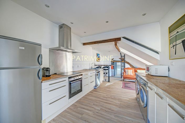 In the very city center, 5 minutes to the RER, 1 minute to Place du Marché, on the top floor of a well-maintained old building with recent external renovation, charming two-room apartment with 52 m² of floor space or 42 m² Carrez law, laid out as follows: entrance, living room with exposed beams, open equipped kitchen, sleeping area with storage, shower room, toilet. Highly sought-after address in the town center, quiet courtyard location, top floor, good condition, loft-style, bright, view of the rooftops, attractive rental yield. Co-ownership of lots. Charges: 96 Euros / month. Price includes 4.48% buyer's fees. (335,000 Euros excluding fees) (4.48% all-inclusive fees payable by the buyer.)