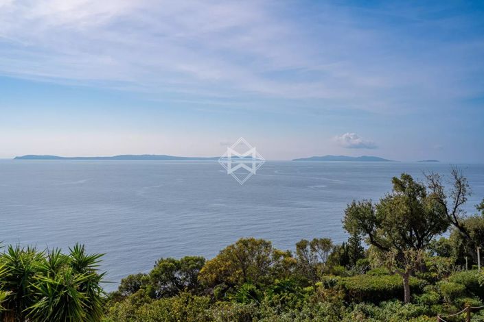 The property features four sea-view bedrooms and three bathrooms. The living room with fireplace and the fully equipped kitchen open onto a spacious terrace overlooking the sea and offering beautiful views of the Golden Islands.