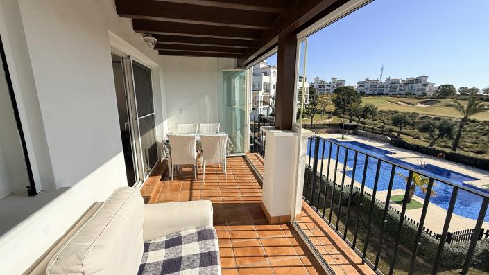 Experience the perfect blend of modern elegance and Mediterranean charm in this stunning 2-bedroom, 1-bathroom apartment. Located within the prestigious Hacienda Riquelme Golf Resort, this property features the highly sought-after curved wall design, offering a unique architectural flair and a spacious, flowy feel.