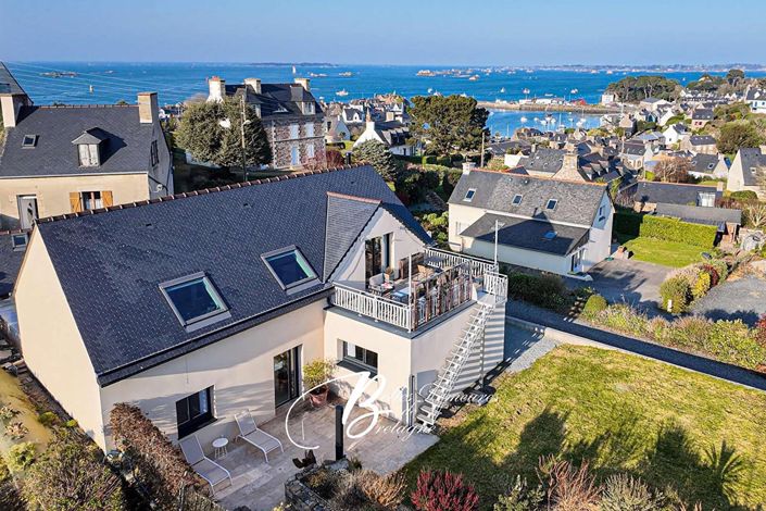 Facing the Bréhat archipelago, the 153 m² house benefits from a sought-after location and a view of the coastline. Upstairs, the main living space with a wood stove opens widely onto the marine landscape: a bright living-dining room extended by a suspended terrace, an open-plan kitchen that naturally accompanies shared moments, a functional utility room, and a WC with a hand basin. Here, the sea becomes a permanent backdrop, changing with the tides.