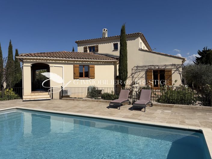 In the heart of a pretty flowering garden studded with olive trees, this beautiful 200 m2 villa enjoys a calm and serene living environment not far from the village center. Above the latticed gate, Mont Ventoux rises into view. Its presence accompanies us onto a wonderful east-to-west terrace, perfect for breakfasts in the sunrise and summer evenings in the sunset. A handsome covered porch, a solidly crafted wooden door, and we are at the heart of the home in a convivial and elegant living space with numerous openings. The artisanal, cozy, and warm kitchen with its beams and granite worktops offers a generous space for cooking and hosting a large table. It opens onto a double living room from east to south. A stone wall delineates the spaces and includes a fireplace insert that provides comfort and well-being. A Crillon stone staircase leads to the upper floor where three bedrooms share a full bathroom. Separate toilets. An independent single-story space consisting of a bedroom with a shower room opens onto a terraced area shaded by a trellis facing the pool. Ideal for hosting, it can also become a beautiful master suite with dressing room and en-suite bathroom for single-level living. The pool is fully secure and surrounded by a lovely travertine deck. A tiled double garage with large storage space on a mezzanine. An exceptionally well-kept residence that can be a main or secondary home and requires no work. "I discovered this architect’s villa on a sunny Sunday, and upon opening the noble entrance door I was immediately seduced by the harmony of volumes and openings with a true coherence in the layout of the spaces. From there, one of the four wooden French doors gives access to the garden and pool, where one can sit to listen to the birds with Mont Ventoux in the postcard backdrop." The location mentioned is exact. Text drafted by our agency and not by artificial intelligence.