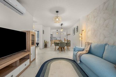 Magnificent 75 m² apartment, completely renovated and ready to move into. The property features three spacious bedrooms, one of which is ensuite, and an additional bathroom, both equipped with showers. It has a modern, fully equipped kitchen with access to a convenient interior patio where the laundry area is located. The living-dining room flows seamlessly into the kitchen, creating a bright and airy open-plan space, ideal for enjoying time with family and friends. All rooms are equipped with ceiling fans and air conditioning, ensuring year-round comfort. The apartment offers partial sea views and enjoys a prime location in Playa del Cura (Torrevieja), just steps from the beach and the promenade, surrounded by leisure areas, restaurants, and all amenities. It is being sold fully furnished and includes a parking space.