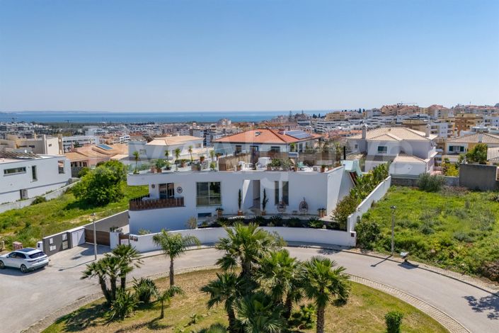 Terrace spaces play a central role in the property’s layout. From the upper rooftop outdoor areas, views toward the Atlantic Ocean become visible across the surrounding neighbourhood. The terrace is generous and accommodates dining or lounge arrangements, encouraging use of the Algarve’s mild climate.