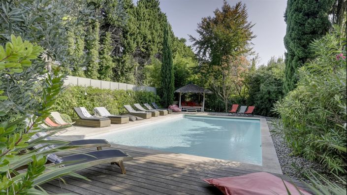 An enchanting outdoor setting. The farmhouse opens onto a 1,400 m2 wooded garden, a genuine oasis of freshness during the summer. Heated outdoor pool (11 x 6 m, April to October) with pool house Terraces and a dining area shaded by a pergola, near a soothing fountain Wooden cabin converted into a home cinema.