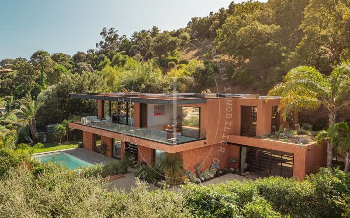 This elegant contemporary villa offers approximately 399 m² of living space. It comprises 5 bedrooms, including a large master suite with two en-suite bathrooms and direct access to the terrace, as well as a total of 6 bathrooms. The living areas, bathed in light thanks to large bay windows, open onto a generous terrace offering panoramic views of the hills, with a glimpse of the sea.