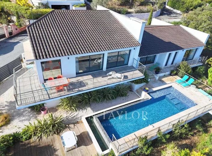 Located within a secure estate in Les Adrets-de-l’Estérel, this contemporary villa of approximately 197 sqm of living space features a bright living room opening onto a large south-east facing terrace, an open-plan kitchen, four bedrooms, one bathroom, one shower room, a study, a laundery room and two toilets, all enjoying a magnificent sea view.