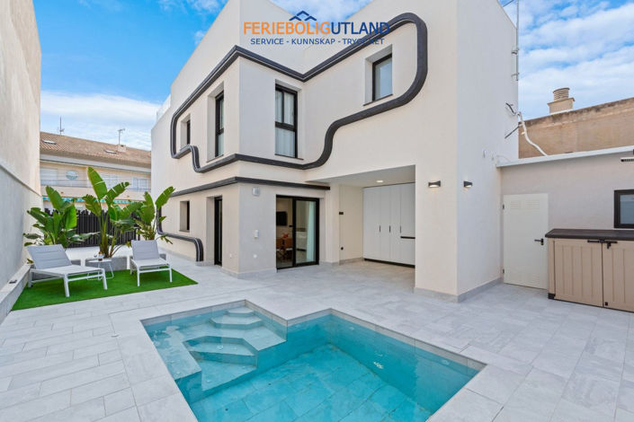 This East Facing, Four Bedroom, Renovated, Semi Detached Villa in Torre de la Horadada is located just a 3 minute walk to the beach, positioned one street behind the sea and promenade which leads you to the marina and a larger stretch of sandy coastline. Torre de la Horadada is a typically Spanish seaside town offering a variety of restaurants and café bars, while Pilar de la Horadada is just a couple of minutes' drive away. Orihuela Costa, La Zenia Boulevard shopping centre, and several golf courses can all be reached in approximately 15 minutes. Recently renovated to a high standard with a unique and stylish design, this impressive 121m2 villa is set over two floors and even enjoys sea views. The property offers a bright open plan living space that flows seamlessly to the exterior, along with a well fitted modern kitchen. A hallway leads to the stairs for the first floor, while the ground floor also features a double bedroom with double sliding glazed doors out to the garden, and a contemporary shower room. On the first floor, there are three further double bedrooms, including a spacious master with dressing area and an en suite shower room featuring a double vanity. Bedroom four benefits from its own private terrace, and there is also an additional modern family shower room. The 45m2 private solarium is laid with artificial grass and includes a brick-built area with sink — ideal for outdoor entertaining. The garden is tiled and partly laid with artificial grass, and offers off road parking, a private swimming pool, outdoor shower, and an extensive covered kitchen/work area. Additional extras include ducted air conditioning, an irrigation system, and a store room. An exceptional, fully renovated villa in a prime coastal location, perfect for enjoying modern Mediterranean living on the Costa Blanca South.