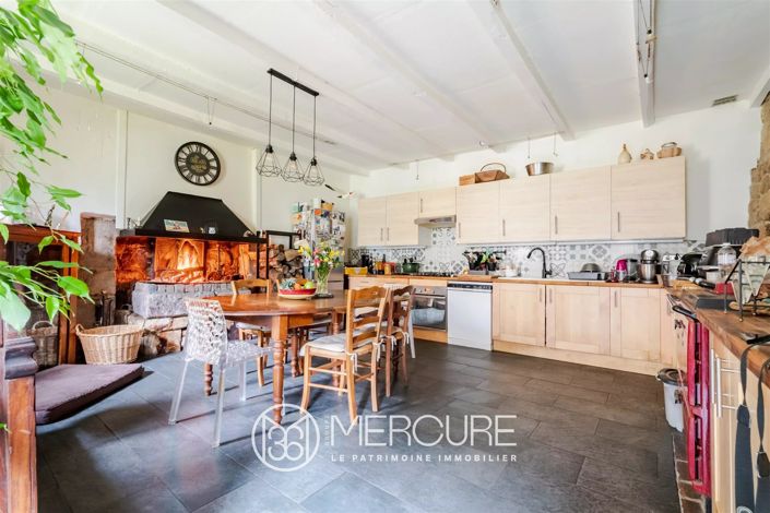 Step inside to a generous living room with a fireplace and wood-burning stove, creating an atmosphere of cozy elegance. The spacious kitchen and dining area, complete with a magnificent fireplace and direct garden access, is ideal for sharing memorable moments with family and friends.