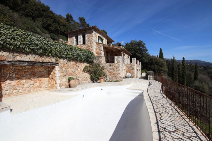 Located in a quiet neighborhood, with no overlooking neighbors, this beautiful dry-stone property of approximately 190 m², including about 59 m² of a separate apartment, sits on 1,889 m² of landscaped grounds. It offers a 180-degree panoramic view from the Bay of Cannes to the edges of Tanneron, a swimming pool with a summer kitchen and barbecue,