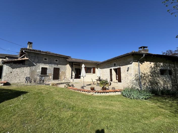 Detached stone house situated in a quiet hamlet location near Chalais. The house has been nicely renovated to provide comfortable living whilst conserving the charm and character. The house is very quirky with an entrance hall, impressive kitchen/dining room with lovely old beams, stone walls and feature fireplace with wood burner and a door to the terrace where you have lovely views over the garden 3300m2. There is a lounge, bedroom with ensuite shower room, WC. A bedroom with ensuite shower rooms and a family bathroom, the corridor leads to a room to renovate, this could make a spacious living room, there is a door to the garden. A staircase leads to a bedroom/office with WC and handbasin, the 4th bedroom has an ensuite shower room, WC.