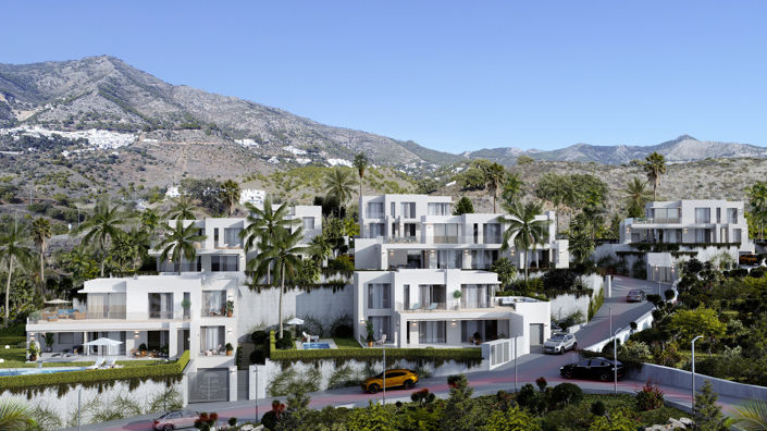 A boutique development of 7 villas in Mijas Pueblo, located between Fuengirola and Marbella, combining modern design with Mediterranean style. Each villa (built area: 219–296 m², plots: 538–945 m², interior: 147–176 m²) includes 4 en-suite bedrooms, walk-in closets, spacious terraces, a private garden, a swimming pool (3.3 m × 8.6 m), and a garage. Features include Siemens (or similar) appliances, underfloor heating, air conditioning, aerothermal hot water system, porcelain tile floors, 2.4 m high doors, and a video intercom. Villas 1, 5, 6, and 7 are equipped with elevators. The location offers stunning sea and mountain views and easy access to beaches, golf courses, AquaMijas water park, sports centers, schools, supermarkets, and restaurants. Less than 20 minutes from Malaga Airport and the train station.