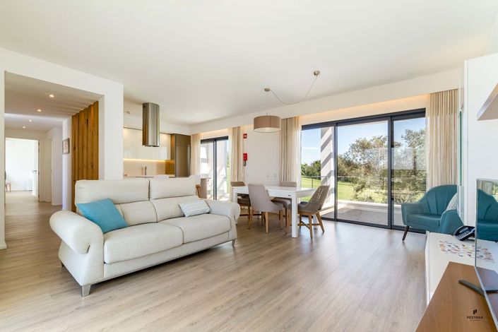 This modern property is located on the first floor and features a spacious open-plan living room with a fully equipped kitchen. From this area, there is direct access to generous balconies offering panoramic views over the fairway.