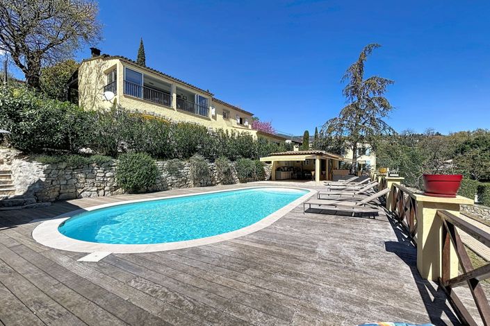 In a peaceful setting, you will find a spacious house with, on the ground floor, an entrance hall, a large living area, a fully equipped kitchen, a single bedroom, a second bedroom with an en-suite shower room, and an additional shower room. On the garden level, there are three bedrooms, one of which has a private shower room, an office, a dedicated Tv room, a laundry room, a toilet, and a gym room complemented by a sauna. Outside, a stunning pool area is sure to charm you, complete with its own pool house.