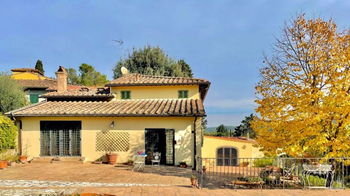 Restored, with independent studio, panoramic courtyard, hand-polished terracotta, exposed beams and fireplace, for sale in Lastra a Signa. Splendid 370 sq m (3,982 sq ft) rustic estate with a 250 sq m (2,690 sq ft) courtyard and 1.05 hectares (2.59 acres) of land with an olive grove, just 20 km from Florence. The heart of the estate is a four-sided independent farmhouse, recently restored to enhance its authentic Tuscan rustic charm: hand-polished terracotta floors, exposed beam ceilings, and a majestic 861 sq ft / 80 sq m living room with a stone fireplace. The main residence includes a spacious eat-in kitchen, a study (or third bedroom), and a grand living area on the ground floor, which opens onto a 2,690 sq ft / 250 sq m panoramic stone courtyard. On the first floor, two large master suites with private bathrooms offer maximum comfort. Adjacent to the main building, an elegant 484 sq ft/ 45 sq m independent studio serves as an ideal guest house or staff quarters. The property is fully fenced and accessible via an automatic gate, including an 915 sq ft / 85 sq m garage and laundry facility with a cellar. A perfect blend of rural elegance and proximity to the city.
