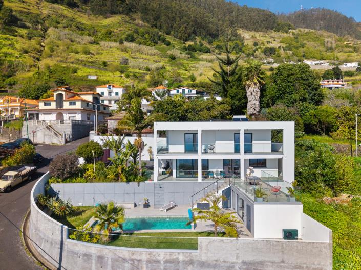 Discover this excellent 3+1 bedroom villa, where comfort, elegance and a privileged location come together. Completely renovated in 2022/2023, this two-floor villa in Arco da Calheta offers panoramic views over the sea and mountains. The ground floor features a suite, while the first floor has three large bedrooms, two of which have balcony access with sea and mountain views. The property includes a heated swimming pool with heat pump, a well-kept garden, sauna and Turkish bath, photovoltaic panels, air conditioning in all accommodations, video surveillance, electric curtains, a modern open-space kitchen, laundry room, and parking capacity for up to 3 cars. Situated just 2 minutes from the centre of Arco da Calheta and 10 minutes from the Calheta Marina.