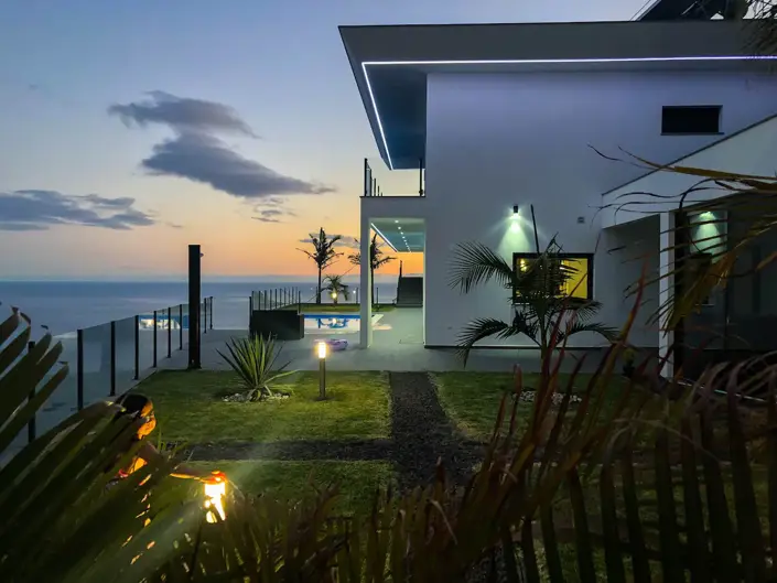 This new 3 bedroom villa was built with the aim of creating a unique space, which allows you to rediscover the concept of physical and mental well-being with magnificent landscapes in a modern architectural environment. Built in 2018 and located in Arco da Calheta, one of the sunniest areas of Madeira Island, the property is 5 minutes from Calheta beach, 25 minutes from Funchal, and 45 minutes from the airport, with cafes, restaurants, parks and medical services just 2 minutes away. The villa features an infinity pool with built-in speakers, a large garden also with speakers, a barbecue area, and a garage for 2 or more cars. All rooms are fitted with electric blinds operated by remote control. The fully equipped kitchen includes a dishwasher, microwave, stove and oven. Each of the three bedrooms has its own en-suite bathroom and direct outdoor access. The plot includes 339 m² to the front and 500 m² on the right side, with additional buildable land adjacent to the property offering expansion potential.