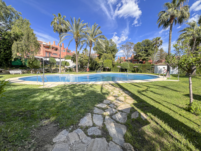 Ground floor apartment in Xarblanca with exceptional private outdoor space in a gated community close to amenities and Marbella town centre with great transport links. Open plan living, dining room and large fully fitted kitchen with direct access onto the terrace area. Large outdoor space, 95m2, lots of room for sunbathing, BBQ, dining alfresco and entertaining. Perfect safe space for kids to play, there is also direct access to the street from the terrace. Two bedrooms and two bathrooms, the master bedroom is ensuite. Both bathrooms have been recently refurbished. Underground car parking space included. The apartment is air-conditioned, hot and cold. The community has a communal swimming pool.