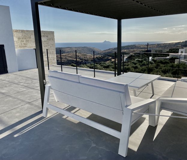 Set against the scenic backdrop of Kamilari, Heraklion - Crete, lies a contemporary villa, completed in 2021. Offering panoramic views of the sea, the charming Cretan landscape, and the sunset, this modern villa is equipped with top-notch amenities such as photovoltaic panels, 24-hour automatic ventilation, a heat pump, underfloor heating, and fan coils for cooling. Covering 157 sqm within a 2000 sqm plot, this residence features two bedrooms, two bathrooms, and an open-plan living room, offering contemporary comforts amidst its natural surroundings. As an added value, the plot features 50 productive olive trees, enhancing the beauty of the landscape and giving you the opportunity to produce your own olive oil.Inside, you'll find a high-quality Italian open-plan kitchen complete with Miele appliances, including a washing machine. Outdoors, a sizable 22 sqm swimming pool awaits. At the rear of the house, an external staircase leads to a terrace providing wide views of the sea, the plains of Messara, the Psiloritis mountain range, and the Asterousia Mountains.Rentals